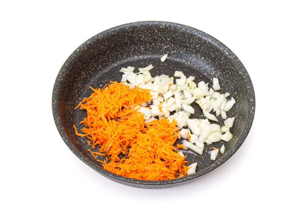 В сковороде разогреть растительное масло, обжарить лук до прозрачности и добавить морковь и обжаривать под закрытой крышкой на среднем огне/мощности в течение 10 минут периодически помешивая.