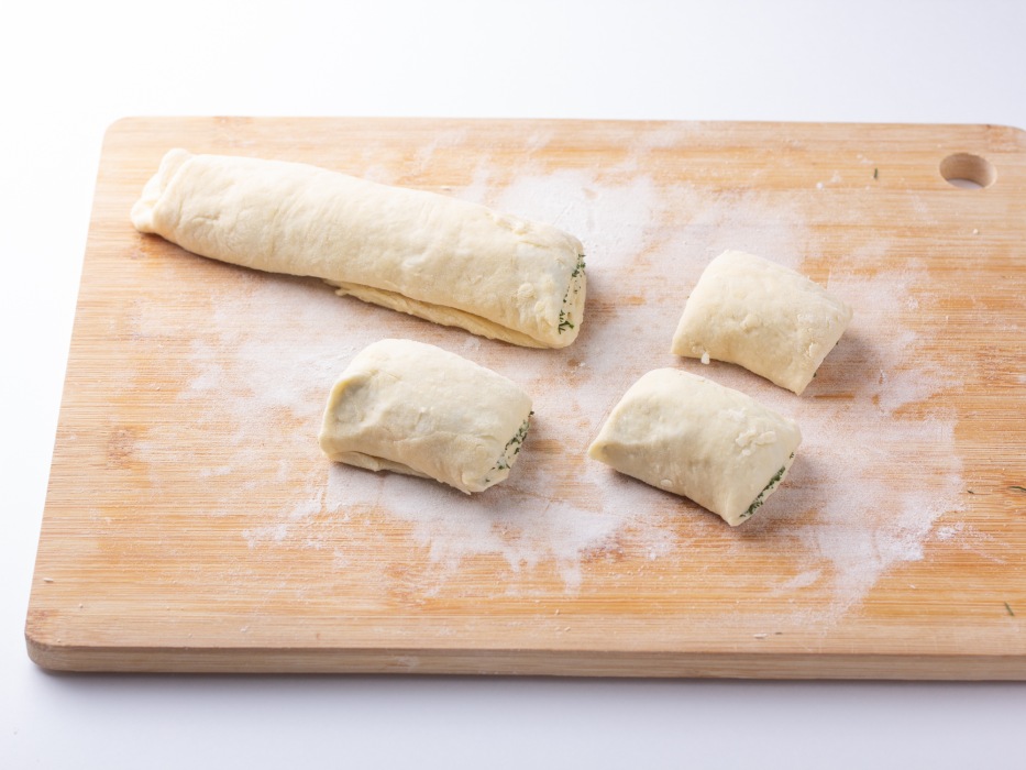 Плотно свернуть тесто с начинкой в аккуратный рулет, после чего разделить его на 6 равных частей, используя нож.
