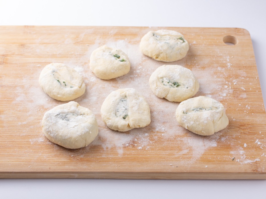 Каждую часть рулета посыпать мукой со стороны срезов, затем поставить заготовку срезом вниз на рабочую поверхность и сверху слегка прижать ладонью, формируя круглую лепешку.