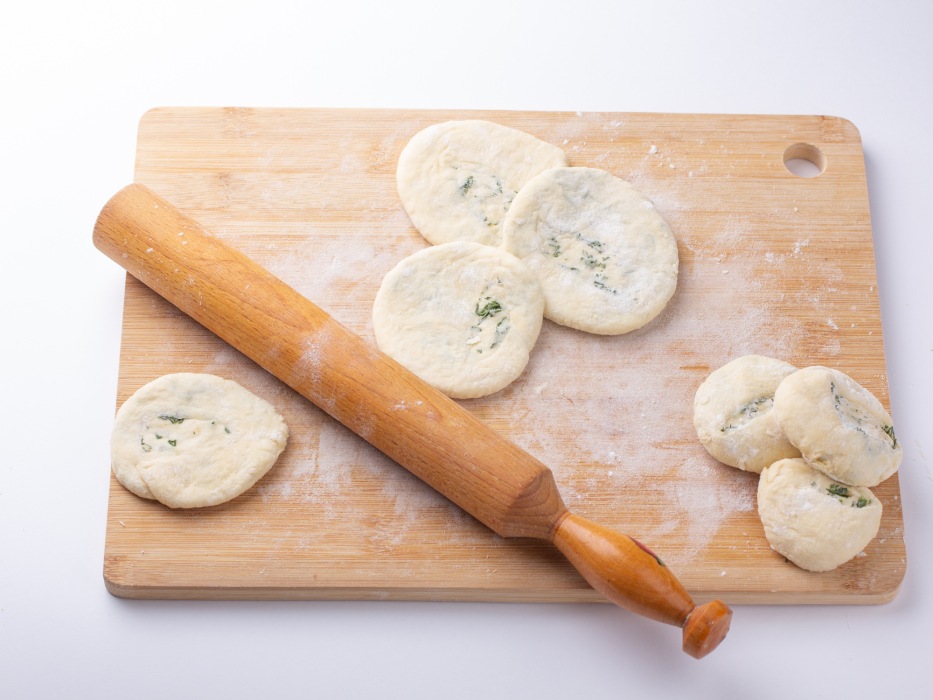 Раскатать придавленные заготовки скалкой до желаемой толщины, при необходимости подпыляя мукой, чтобы тесто не прилипало.