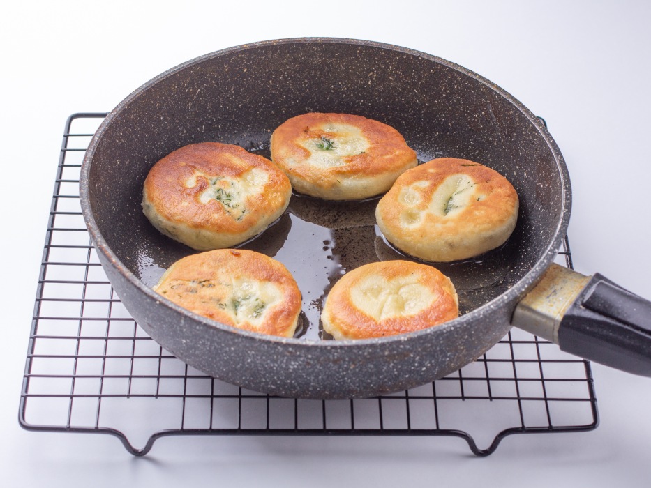 - Не жалейте масла на сковороду. Эти лепешки жарятся во фритюре по сути, поэтому масла должно быть достаточно, чтобы оно доходило до середины лепешки. Жарьте на умеренном огне, чтобы тесто успело пропечься внутри, а не подгорело снаружи.