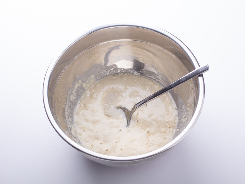 Добавить 50 г муки и сахар. Все перемешать ложкой. Оставить миску со всеми ингредиентами на 10 мин. У вас должны начать образовываться на поверхности небольшие пузыри.