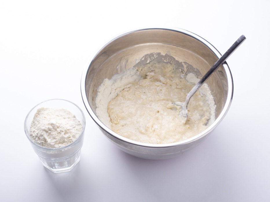 Влить в миску с опарой оставшиеся 100 мл теплой воды, добавить соль и растительное масло, затем перемешать все ингредиенты для равномерного распределения.