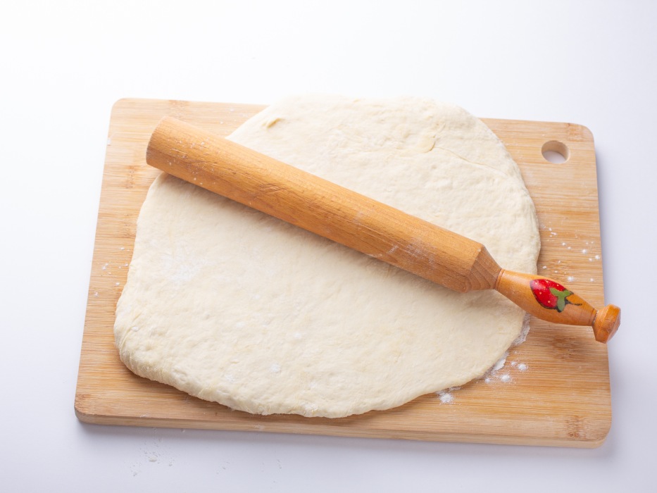 Подошедшее тесто выложить на слегка присыпанную мукой поверхность и раскатать в тонкий пласт толщиной примерно 0,5 сантиметра, придавая ему прямоугольную или круглую форму.