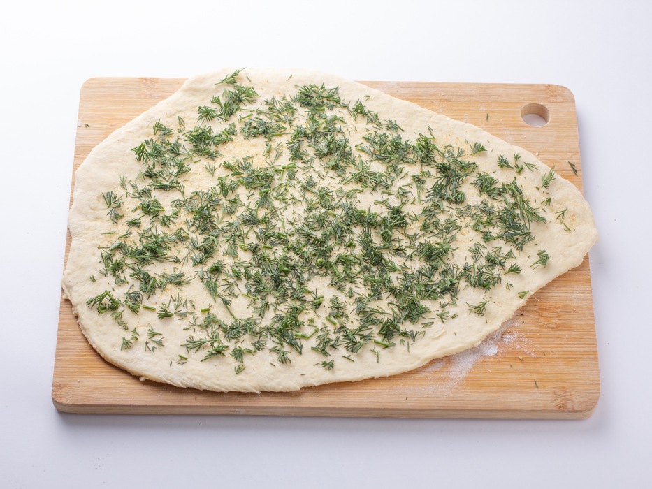 Равномерно распределить по всей поверхности раскатанного теста мелко нарезанный укроп, а затем посыпать сушеным чесноком, слегка вдавливая его в тесто.
