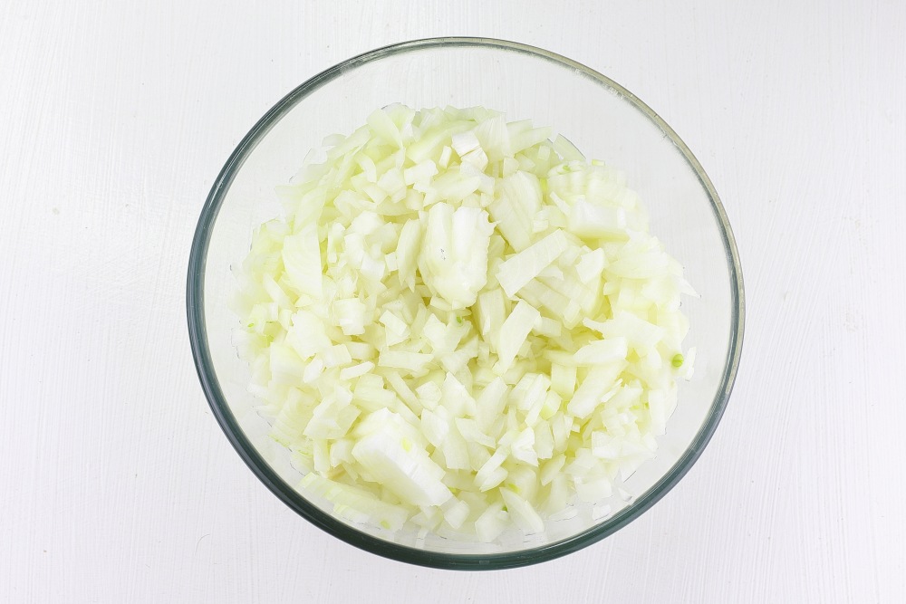 Очищенные головки лука промыть холодной водой, и обязательно обсушить бумажным полотенцем – лишняя влага сделает фарш жидким и помешает формированию румяной корочки. Нарезать лук максимально мелким кубиком (около 2–3 мм).