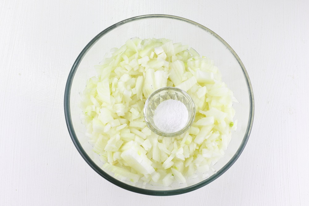К измельченному луку всыпать соль. Оставить массу на 10–15 минут при комнатной температуре – за это время лук выделит достаточное количество сока, а его резкий аромат сменится мягкими сладковатыми нотками.