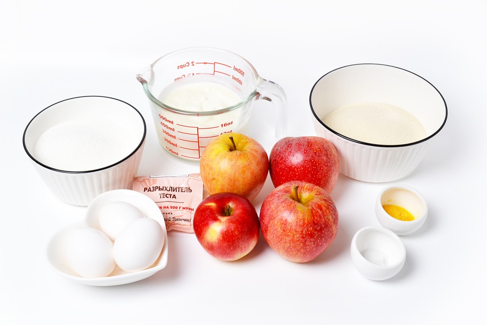 Подготовить продукты: кефир, манку, яблоки, ванильный сахар, соль, яйца и разрыхлитель.