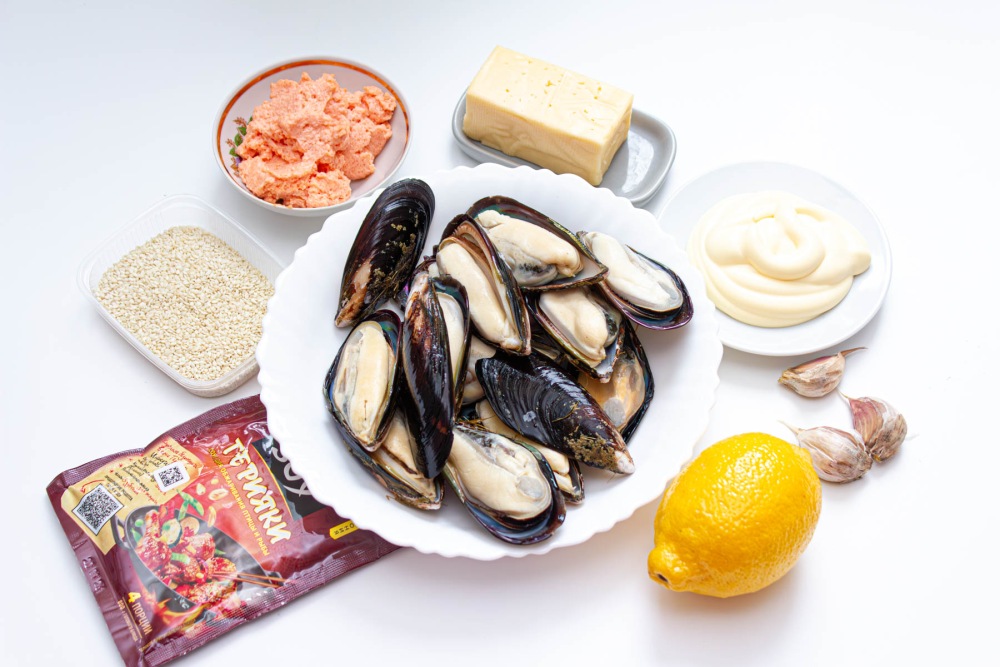 Выбрать свежие или замороженные мидии крупного размера, копченую икру мойвы, твёрдый или полутвердый сыр (у меня Российский), свежий чеснок, майонез, лимон, соус терияки и кунжутные семечки для украшения блюда.