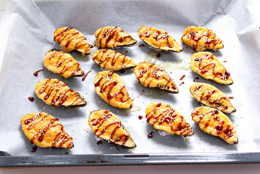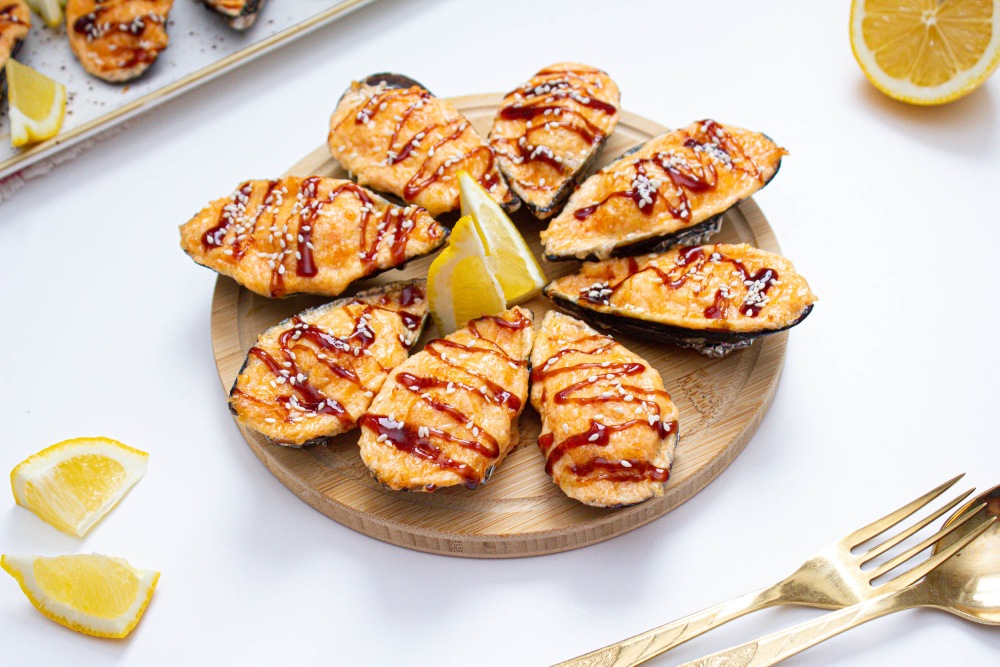 Важно не перегружать мидии начинкой, чтобы она не вытекала при запекании. А чтобы створки стояли ровно, удобно использовать фольгу как основу. Подаются такие мидии лучше всего сразу, пока они горячие — с каплей соуса терияки и долькой лимона для свежести вкуса.