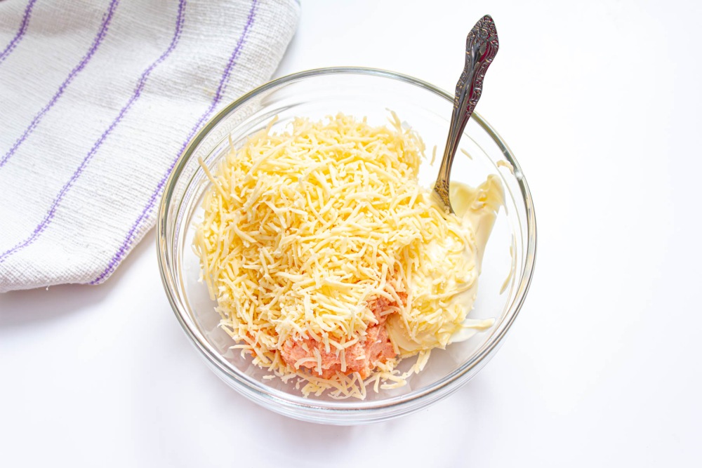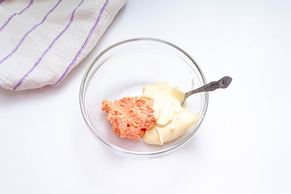 В глубокой миски смешать копченую икру мойвы и майонез.