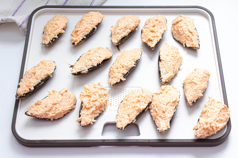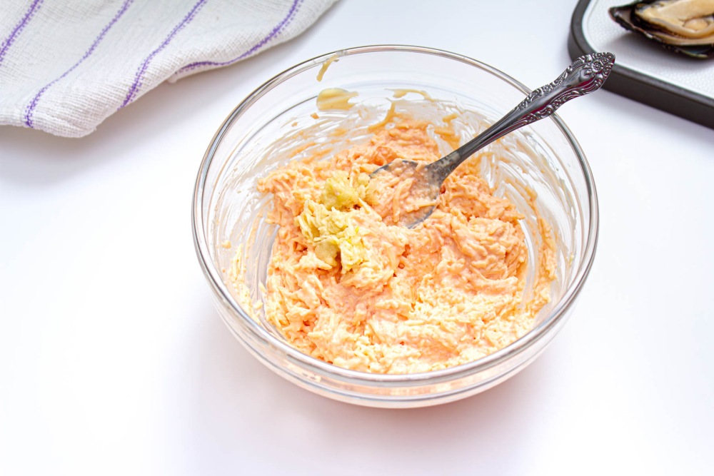 - Чтобы упростить процесс, можно заранее подготовить соус: смешать майонез, чеснок, икру мойвы, сыр, а мидии выложить в форму и “укрыть” этой шапочкой. Запекайте при 180–200 °C не дольше 15-20 минут — так мидии останутся сочными, а сыр не пересохнет.