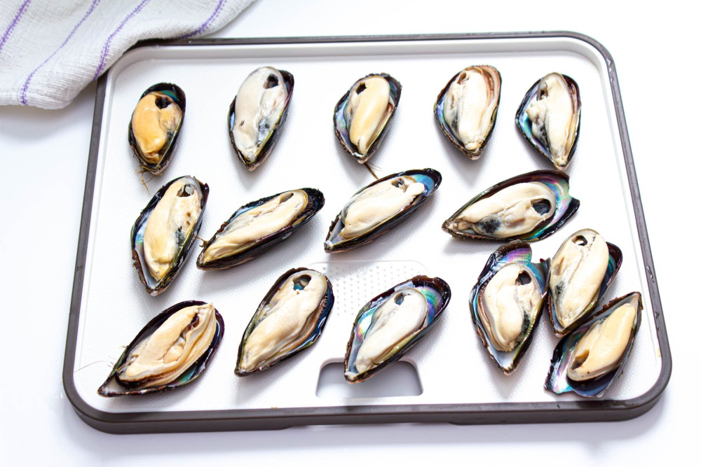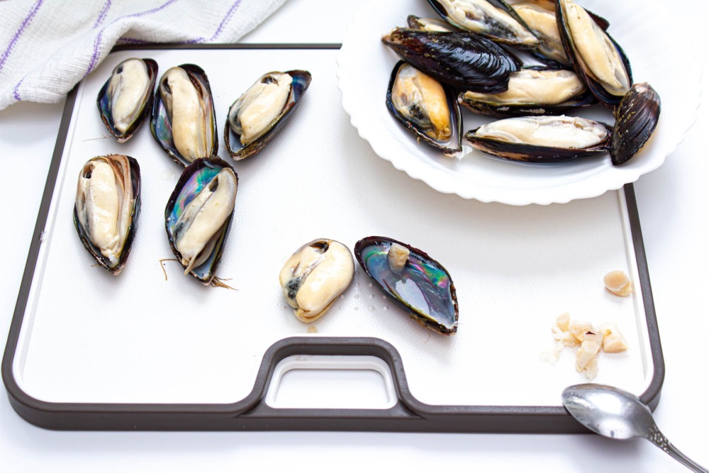 Промыть водой мясо мидии и ракушки. Мясо положить обратно в створку.