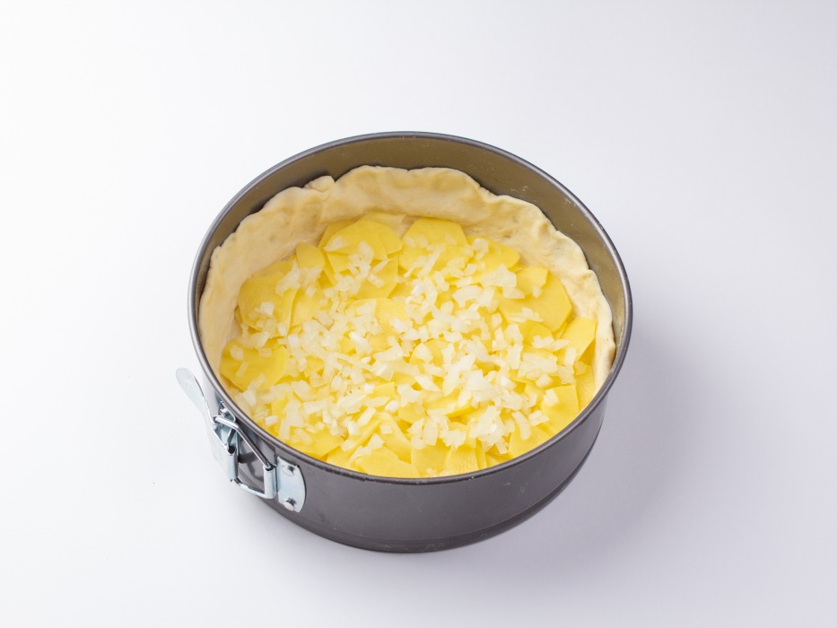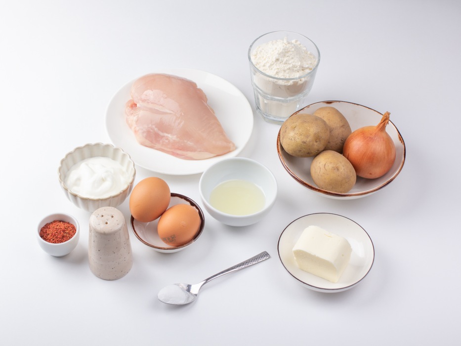 Начинка выкладывается слоями, и каждый из них играет свою роль. Тонко нарезанный картофель хорошо пропекается и впитывает сок мяса, лук даёт аромат, а куриное филе остаётся сочным за счёт нарезки кусочками, а не фаршем. Дополнительные кусочки сливочного масла сверху — не прихоть, а важный момент: они делают начинку мягкой и не дают ей пересохнуть в духовке.