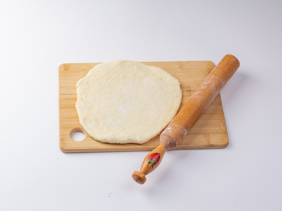 Раскатать одну часть теста. Диаметр этого пласта должен быть немного больше диаметра вашей формы для выпекания. Посыпьте поверхность на которой вы раскатываете тесто мукой, чтобы оно не прилипало.