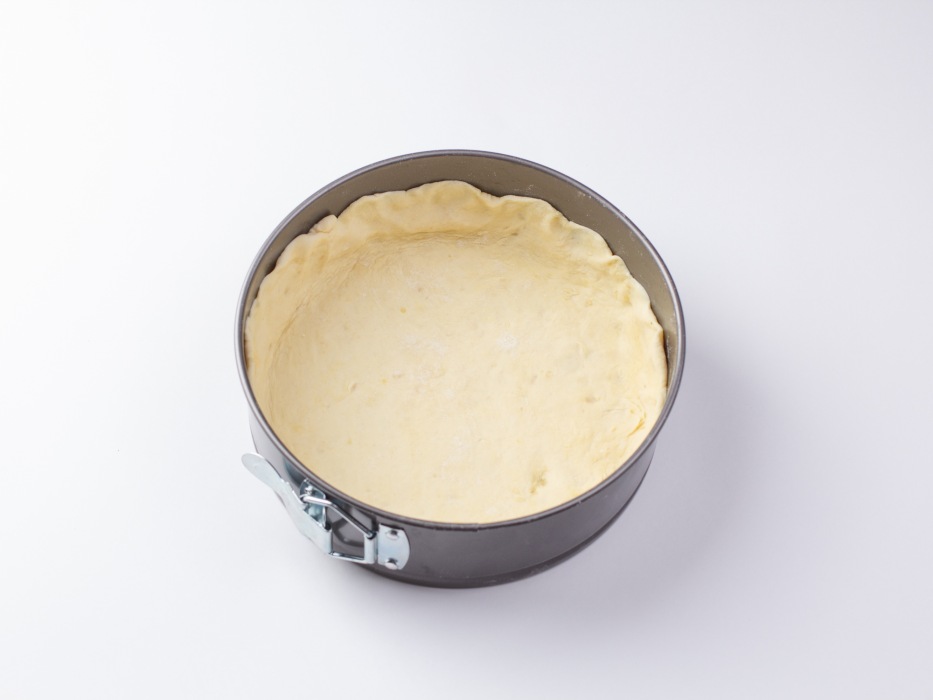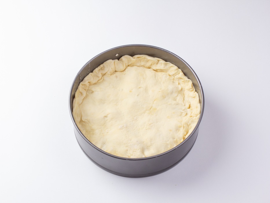 Положить тесто в смазанную растительным маслом форму, сформировать бортики.