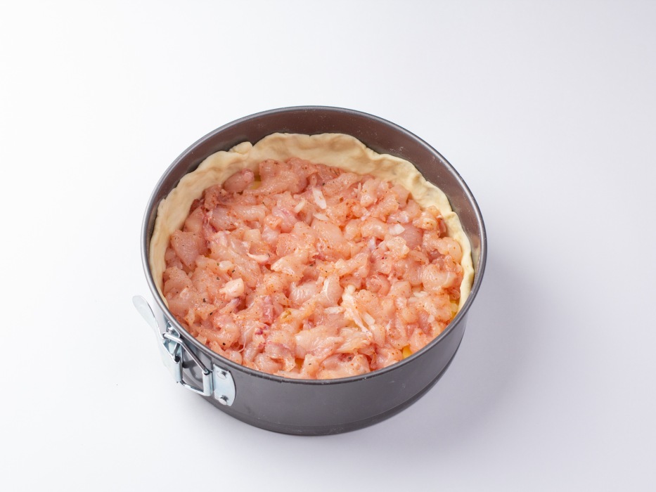 Выложить в форму кусочки куриного филе и равномерно распределить их по все поверхности.