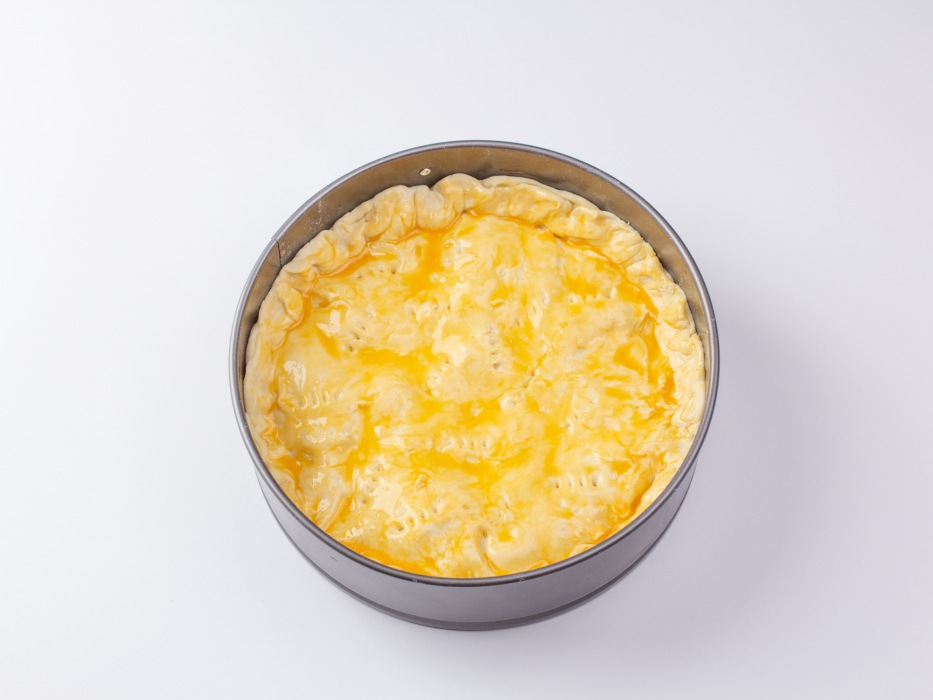 Смазать пирог сверху желтком, сделать проколы вилкой. Запекать в духовке при температуре 180 ℃ 40 минут. Как только пирог зарумянится, накройте его фольгой и продолжайте выпекать.