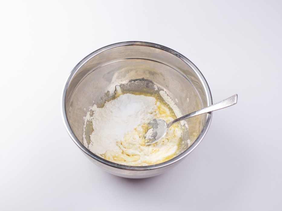 В миску добавить просеянную муку небольшими порциями, в одну из порций добавить соду.