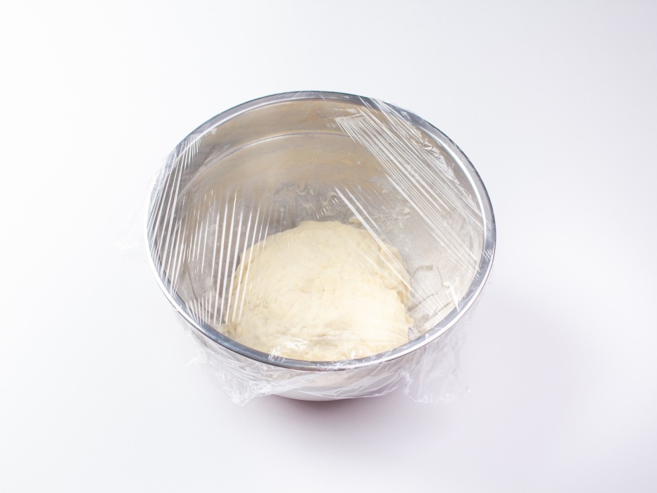 Замесить тесто, положить его в миску, накрыть пищевой пленкой и оставить на 20 минут при комнатной температуре.