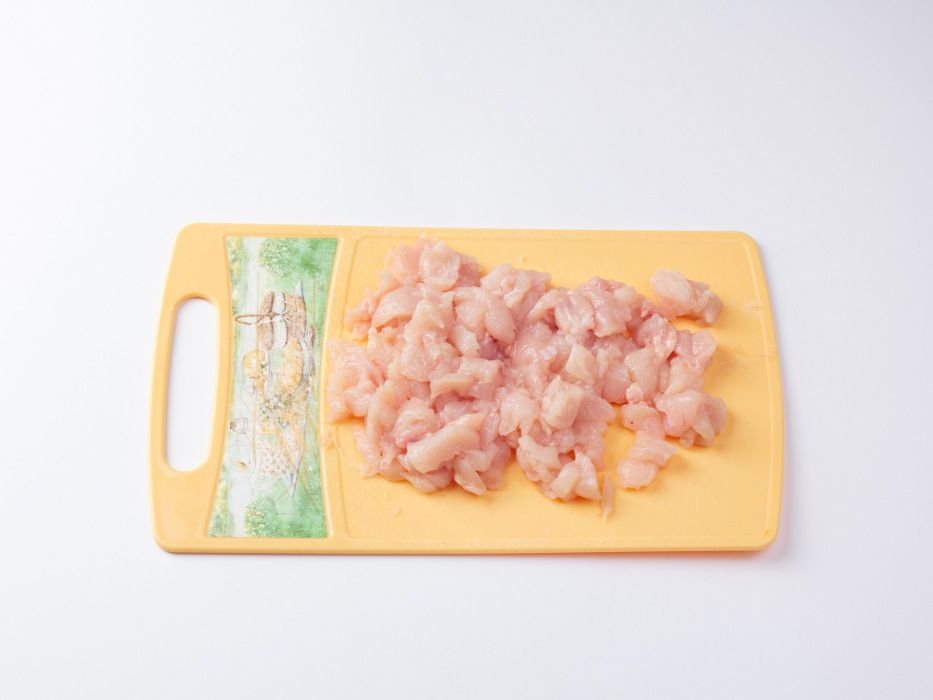 Мелко нарезать куриное филе. Кусочки сохранят свою форму и собственный сок при выпекании, что сделает начинку не сухой, а сочной.