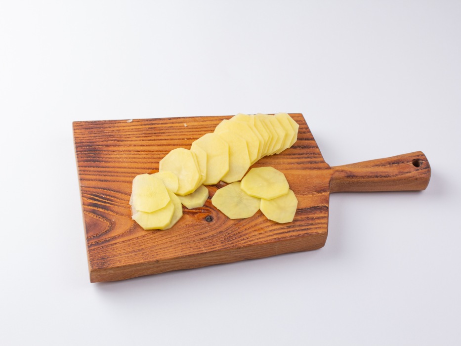 - Картофель нарезать очень тонко, толщиной 1–2 мм, используя острый нож.