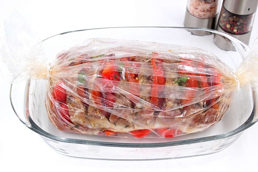 Сделать пару крошечных отверстий, что бы пар не разорвал пакет при запекании.