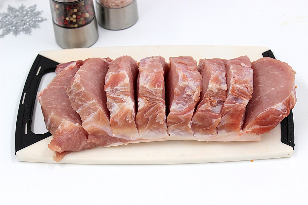 В мясе сделать глубокие надрезы, не доходя примерно 1 см до конца. Ширина кусков около 1,5- 2 см.