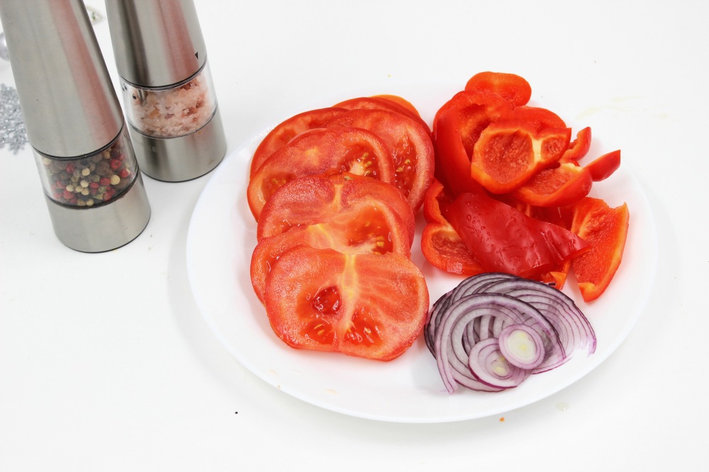 Просто представьте, что всё это вам надо поместить в разрезы и овощи не должны особо вылазить. Помидор шайбами, перец кусочками, а лук тонкими кольцами, что бы он спокойно успел пропечься, а не похрустывал на зубах.
