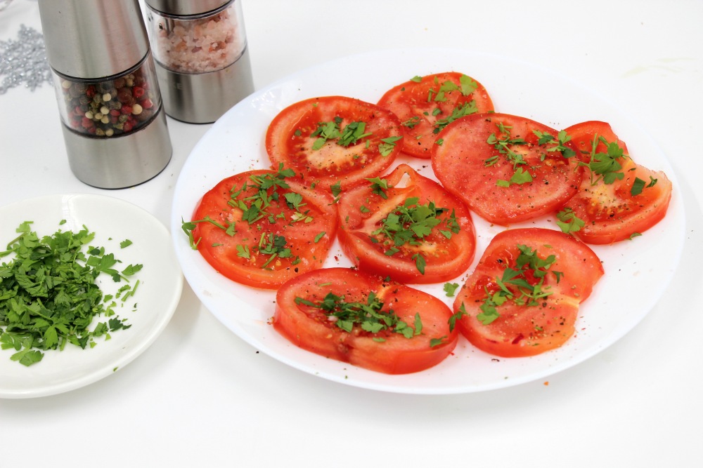 Петрушку измельчить и ровно половиной присыпать помидоры. Немного посолить, поперчить.