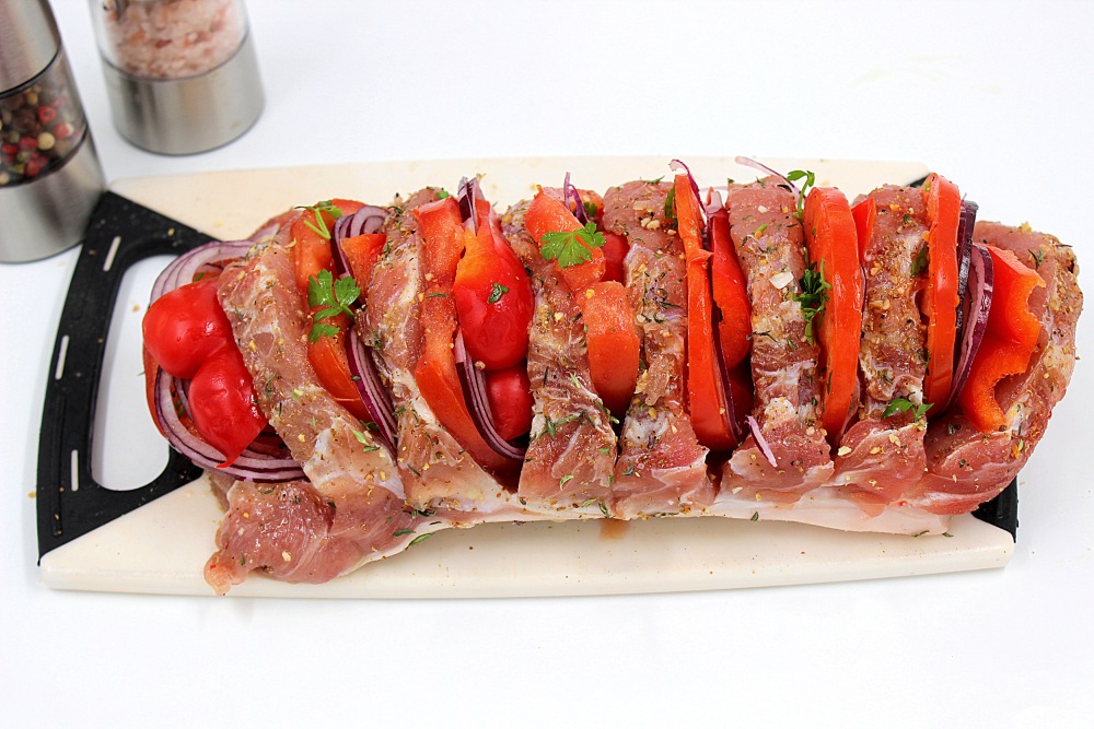 Свинина ( а в моём случае именно она ) глубоко надрезается, не доходя до конца буквально сантиметр, и вот между этими разрезами выкладываются овощи. Особенно красиво, когда используются что-то яркое, делая мясо по настоящему праздничным. Легкие вкрапления зелени и получается чудесная цветовая палитра.