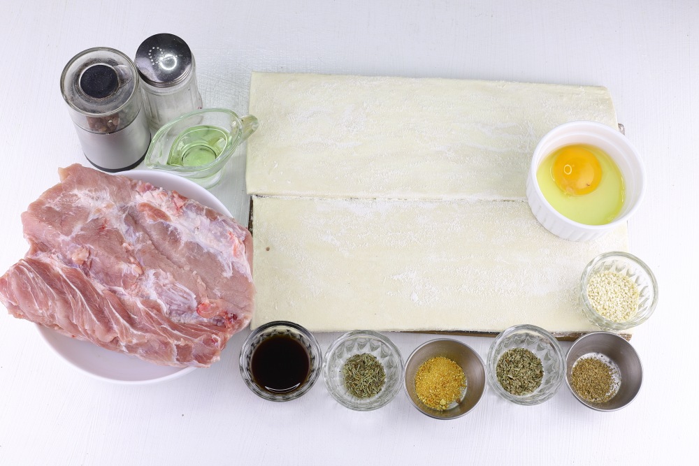 Подготовить необходимые ингредиенты для рецепта мяса в слоеном тесте на новогодний стол.