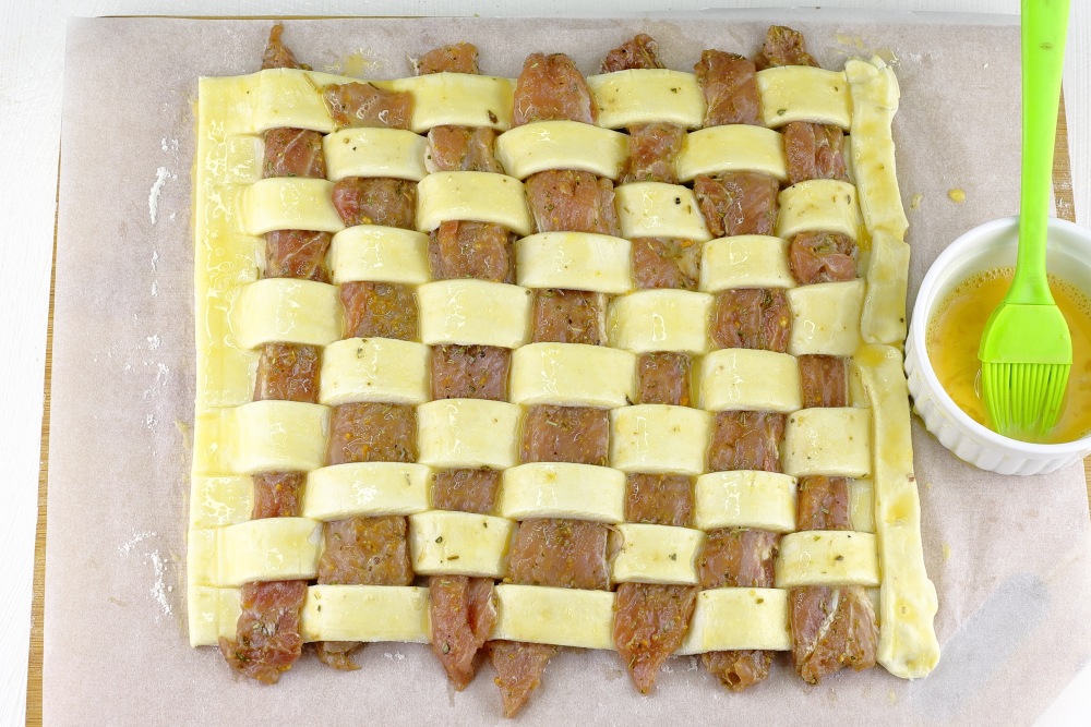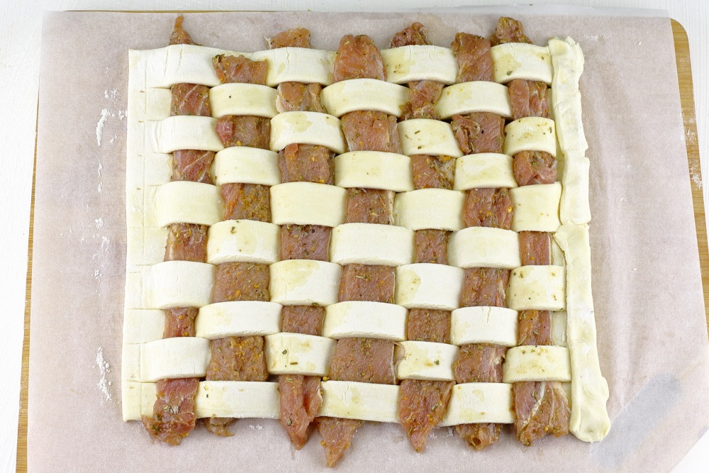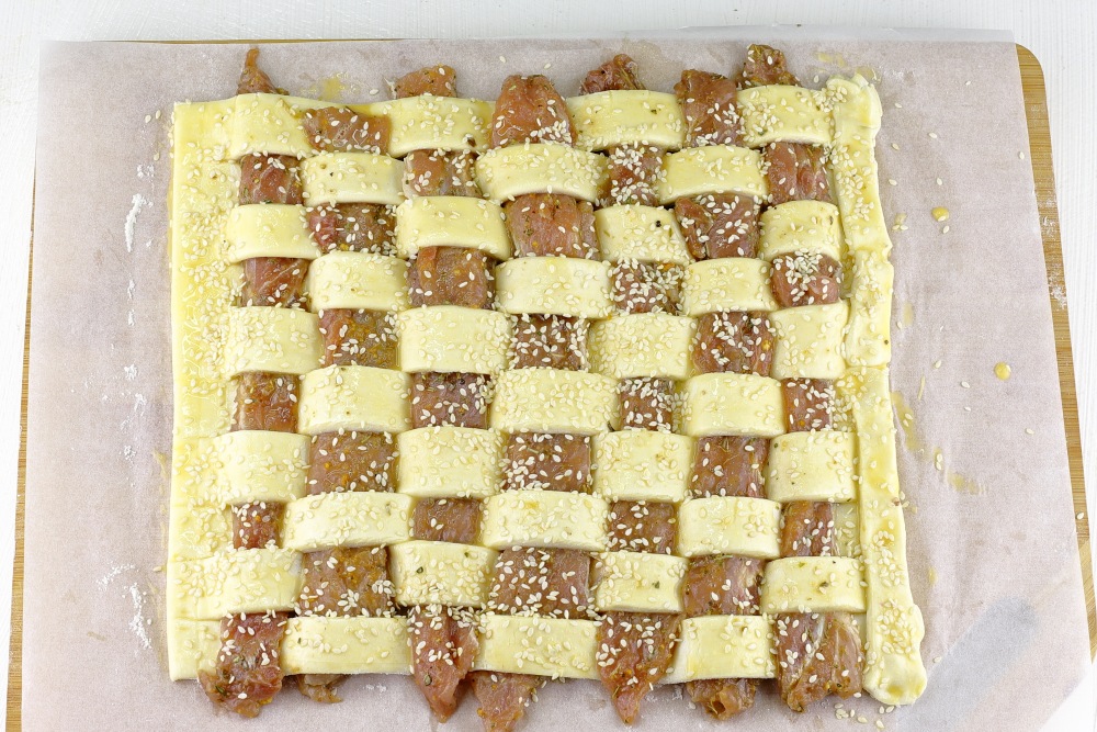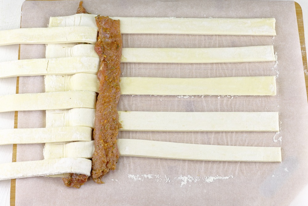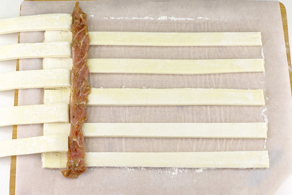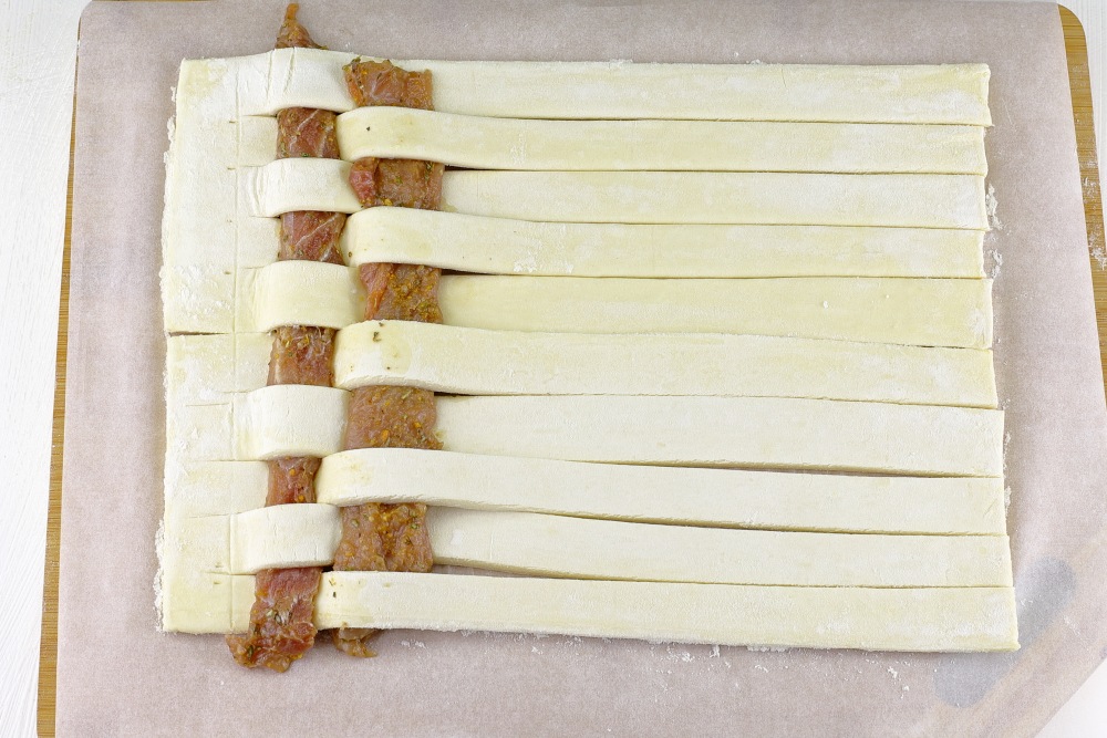 Накрыть мясо полосками теста.