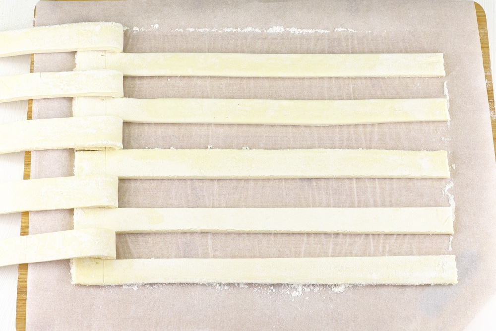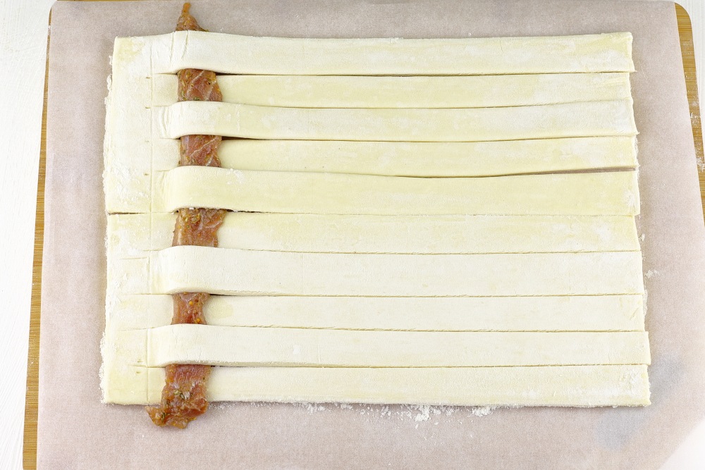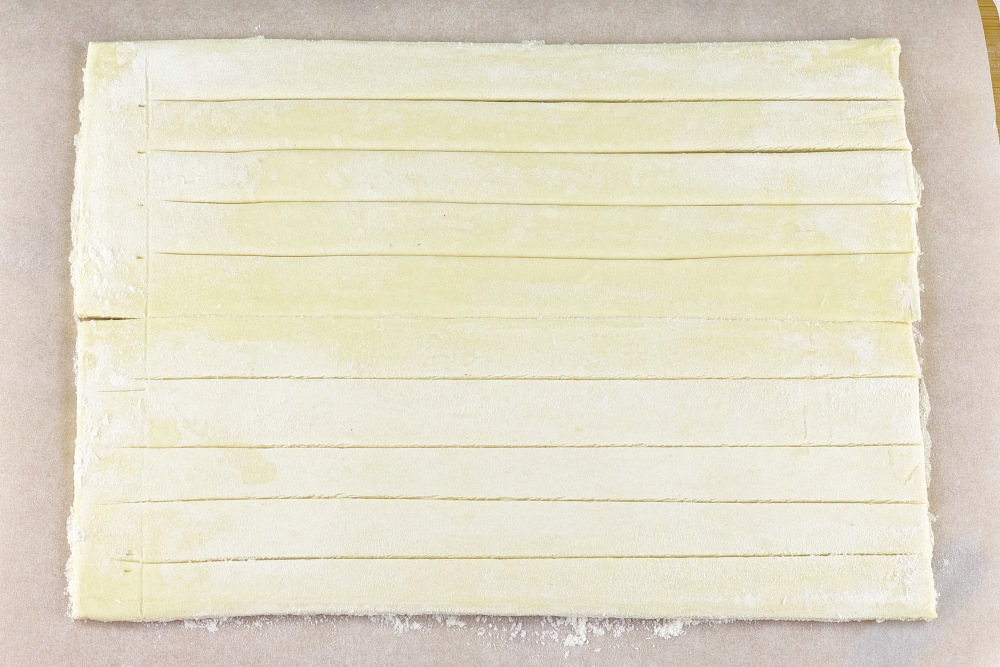 Размороженное тесто должно быть холодным, но не слишком твёрдым. Если оно слишком твердое после размораживания, можно оставить его на 5-10 минут при комнатной температуре, чтобы оно стало мягче. Разрезать пласт теста на полоски шириной 1,5-2 см по длинной стороне, не дорезая до одного края примерно 1,5 см. У меня получилось 10 полосок.