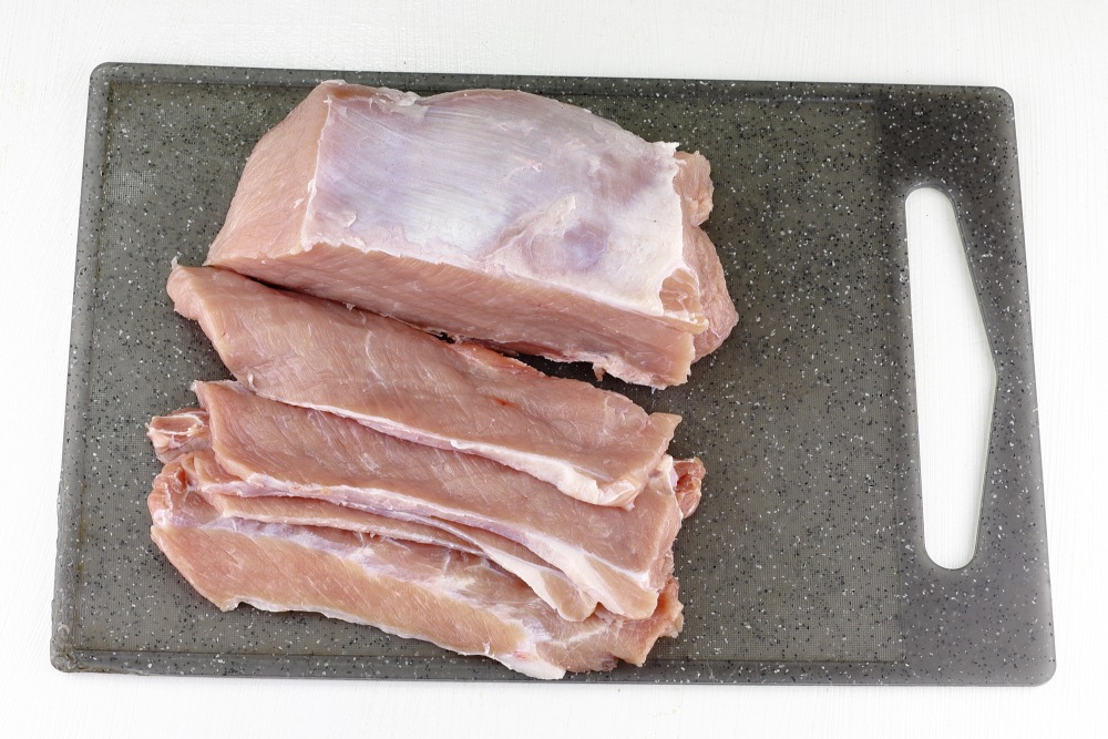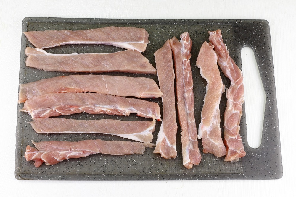 Свинину нарезать вдоль волокон, шириной слайса около 1 см.