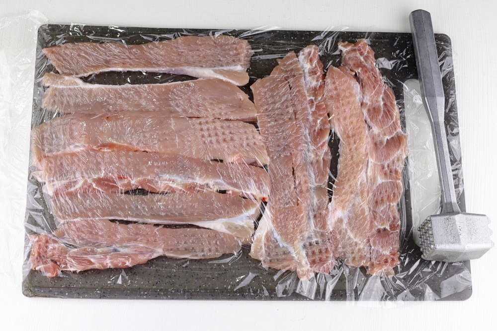 Выложить слайсы в один слой на чистую разделочную доску или любую другую плоскую поверхность, чтобы полоски мяса не перекрывали друг друга, так как это обеспечит более равномерное воздействие при отбивании.