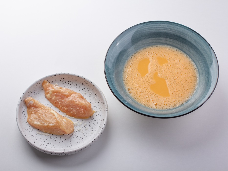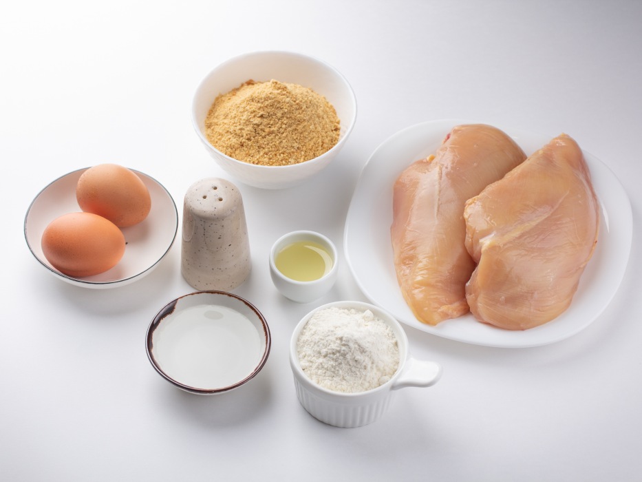 Подготовить все ингредиенты для наггетсов из куриной грудки в домашних условиях на сковороде.