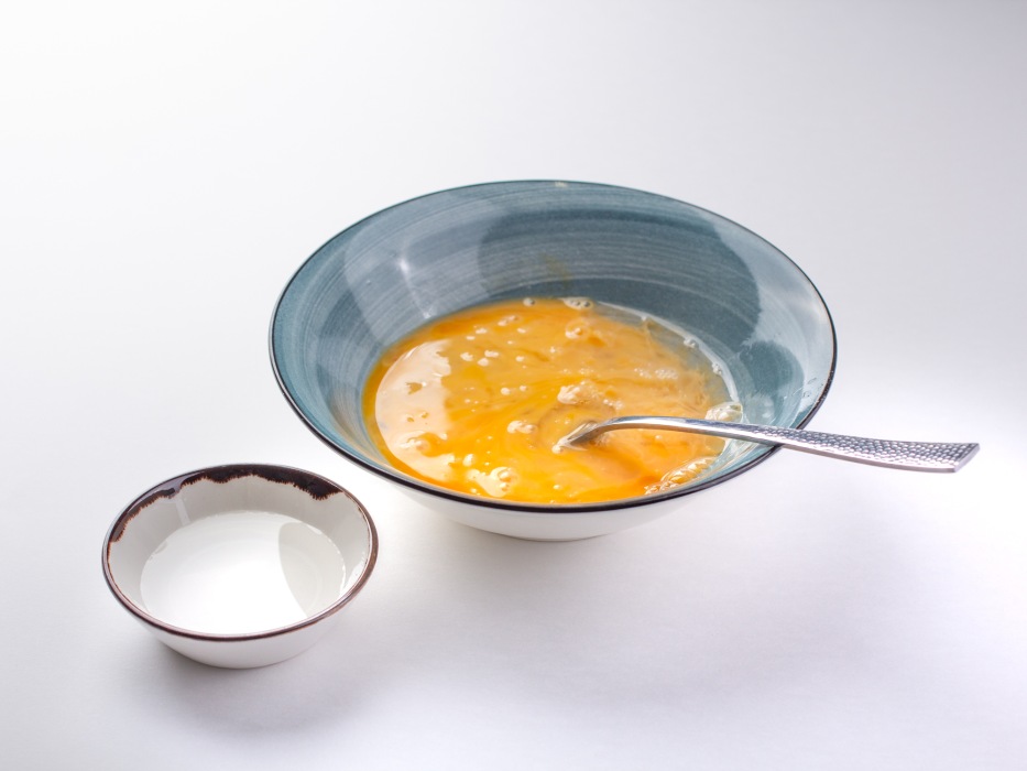 Вилкой взбить яйца, добавить к ним воды и еще раз взбить.