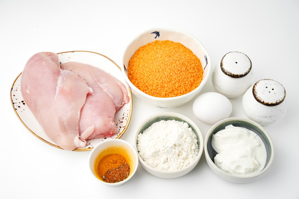 Подготовить ингредиенты для наггетсов в аэрогриле в домашних условиях. Достать куриное филе из холодильника заранее, чтобы оно не было слишком холодным. Также миски для маринада и панировки, венчик или вилку, тарелку и подготовить чашу аэрогриля.
