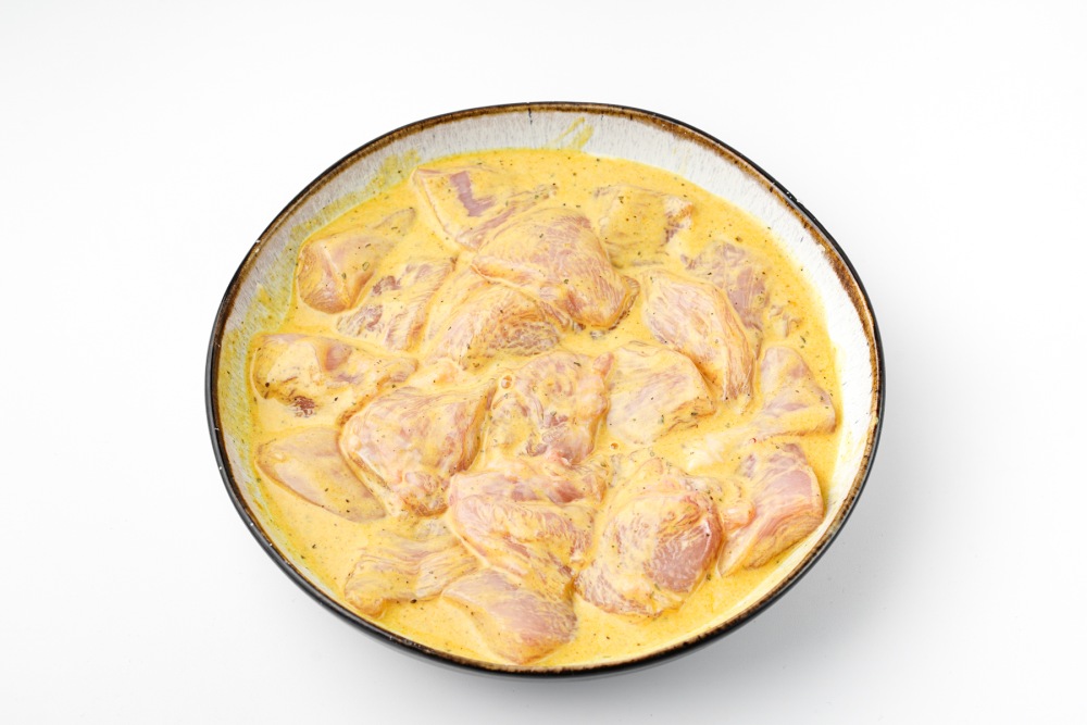 Добавить нарезанные кусочки курицы в миску и тщательно перемешать руками или ложкой, чтобы каждый кусочек был полностью покрыт маринадом. Оставить на 5–10 минут для лучшего вкуса.