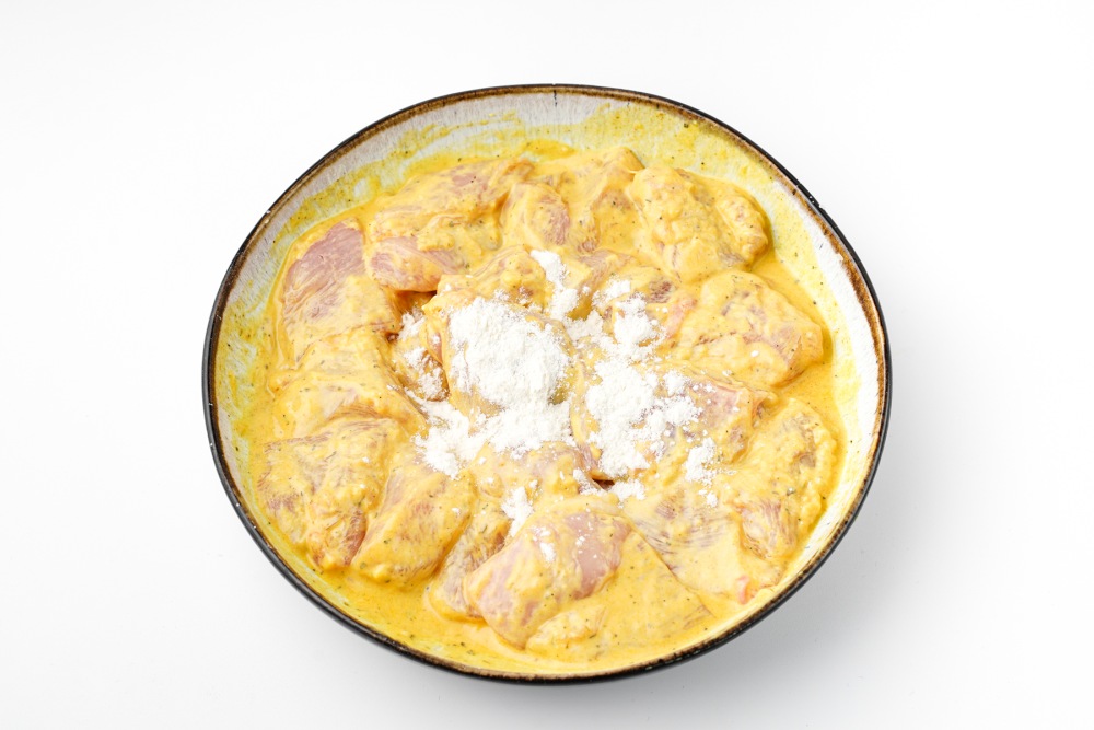 Всыпать муку к курице и снова аккуратно перемешать. Мука создаст тонкий слой, который поможет панировке лучше держаться.