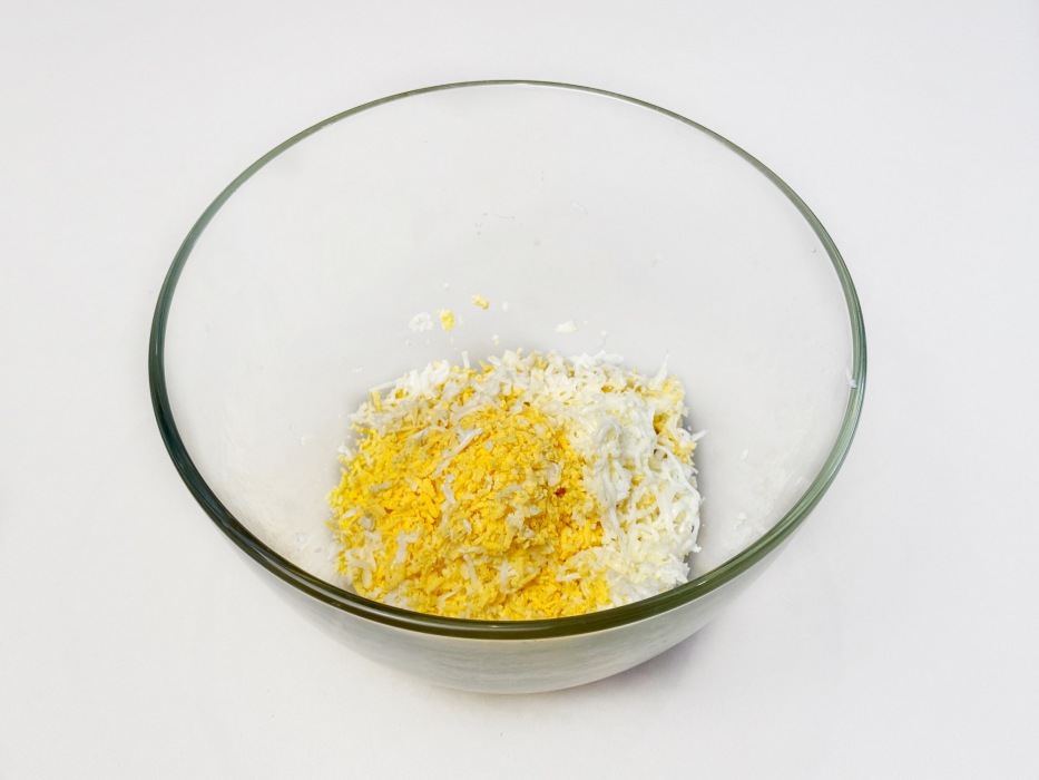 Подготовить глубокую емкость и натереть в нее яйца на мелкой терке.