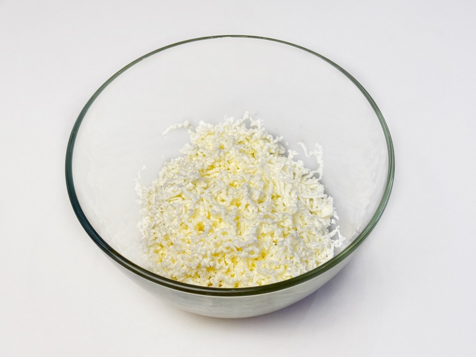 Затем твердый сыр натереть на мелкой терке в емкость.