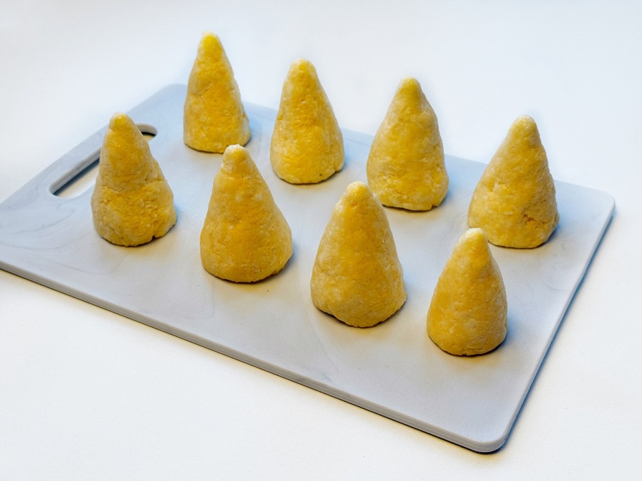 Из сырно-яичной массы сформировать небольшие конусы, будущие елочки.