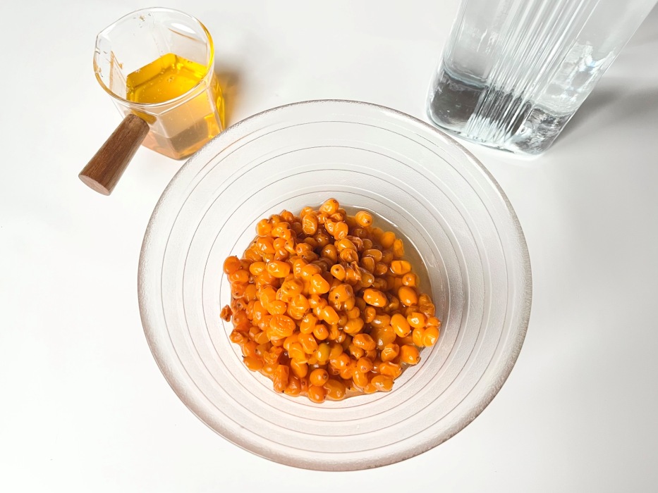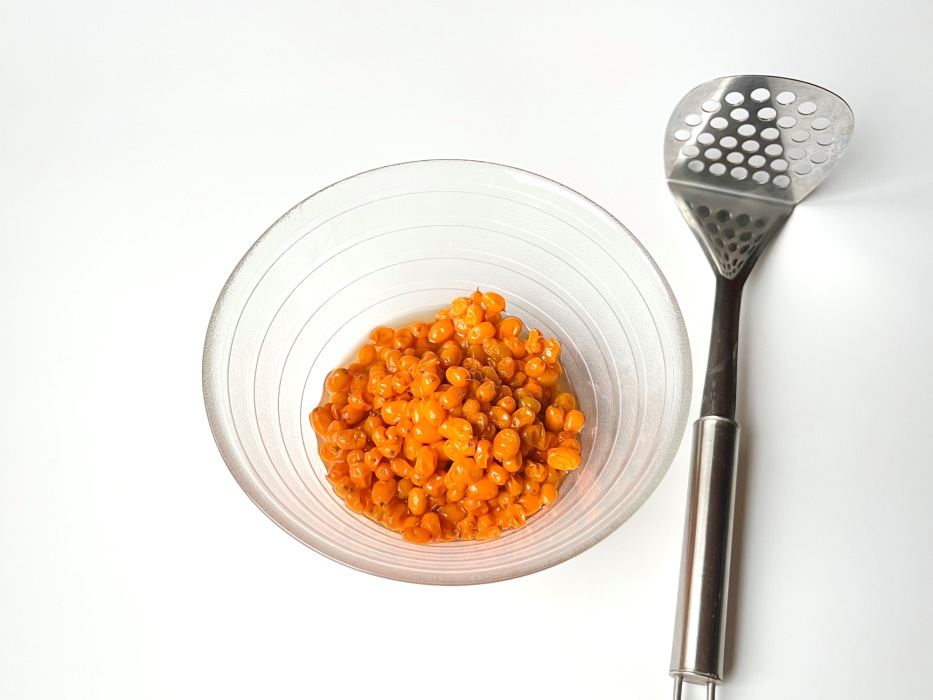 В глубокой миске размять толкушкой ягоды облепихи. Делать это нужно тщательно. Чем больше сока получится “добыть” из ягод на этом этапе, тем насыщеннее по цвету и количеству витаминов мы получим напиток. У нас должен получиться яркий, густой, ароматный сок.