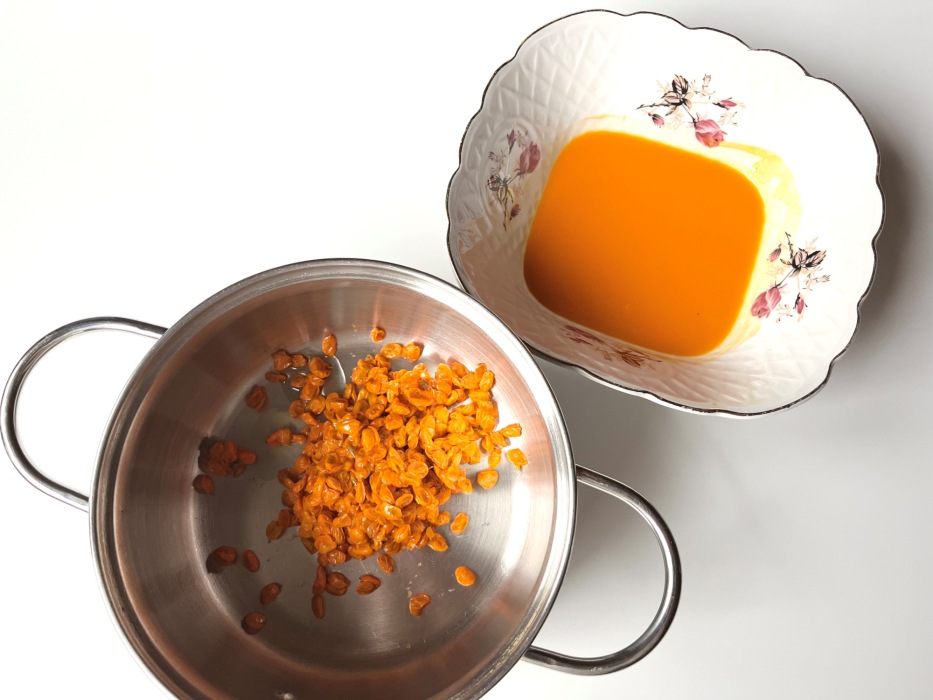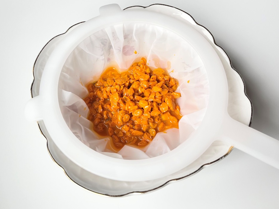 На выходе должны получиться чистый облепиховый сок и густой жмых. Не выкидывайте ничего из этого! Нам пригодятся обе массы.