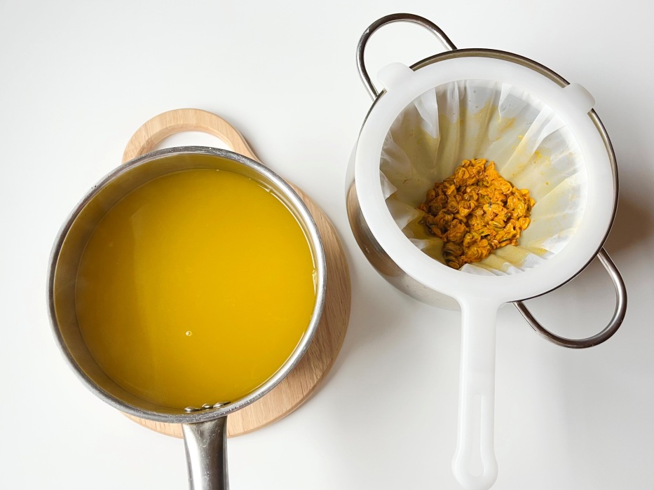 Пропустить через сито содержимое кастрюли. У нас получится сухой жмых и облепиховый горячий отвар. Жмых нам больше не пригодится, он отдал все самое ценное. А горячий отвар необходимо немного остудить.