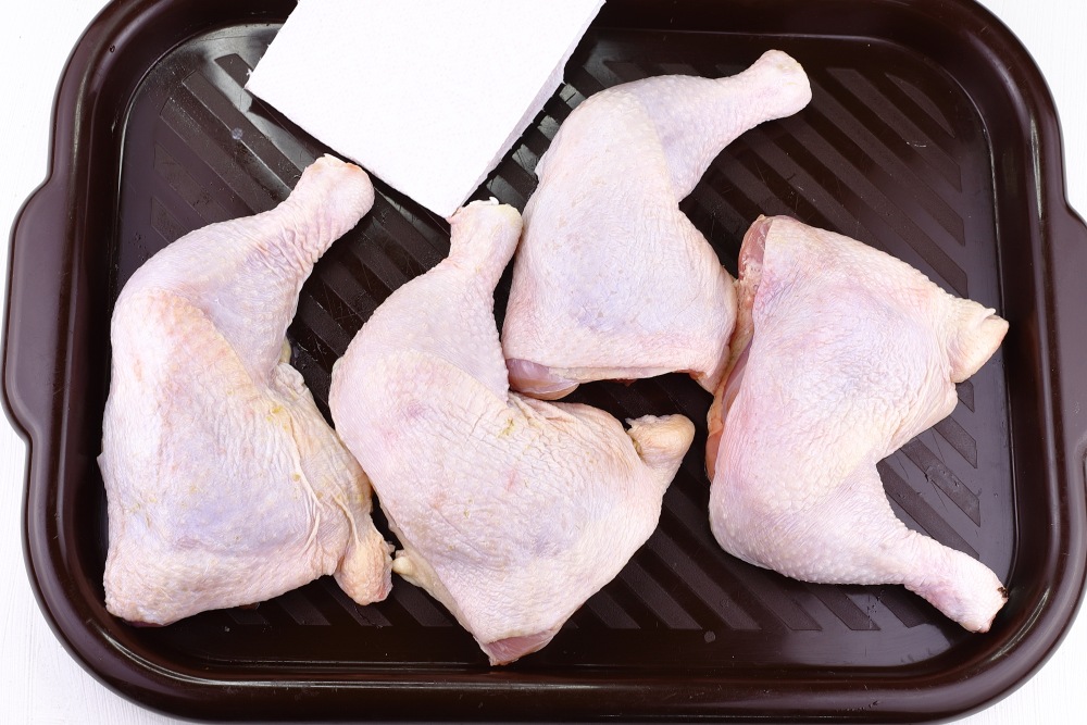 Куриные окорочка хорошо промыть и обсушить бумажным полотенцем.