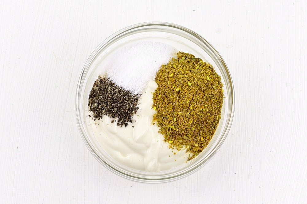 В глубокой миске соединить майонез, соль, молотый черный перец, приправу для курицы. Если готовая приправа для курицы уже содержит соль, дополнительно солить маринад не нужно.