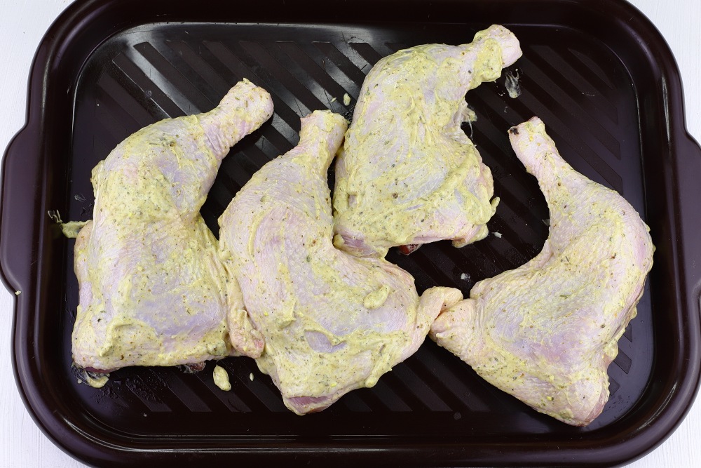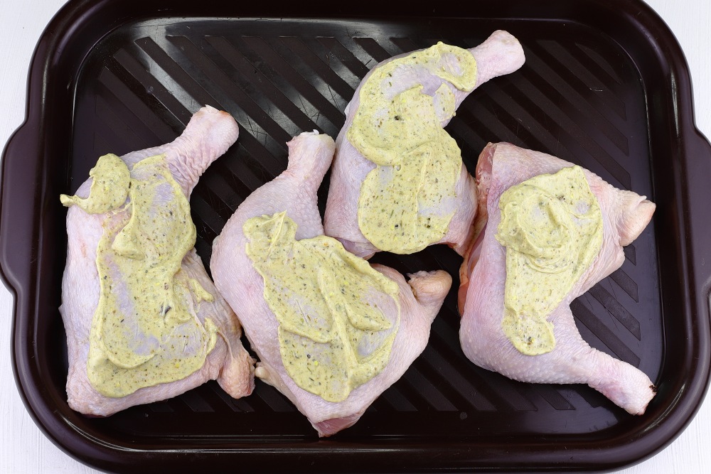 Распределить маринад по всей поверхности окорочков со всех сторон, втирая его в мясо.